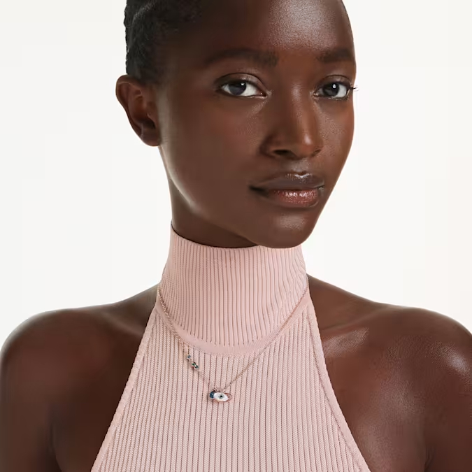 Αυτό το μενταγιόν Μάτι προσθέτει μια μυστηριακή πινελιά σε κάθε εμφάνιση. Διαθέτει ένα μοτίβο ματιού σε μπλε, μαύρα και διαφανή κρύσταλλα pavé και ένα σε μέταλλο με επιμετάλλωση σε ροζ χρυσό τόνο. Το μενταγιόν συνοδεύεται από αλυσίδα με επιμετάλλωση σε ροζ χρυσό τόνο, διακοσμημένη με σκούρα μπλε κρύσταλλα.
