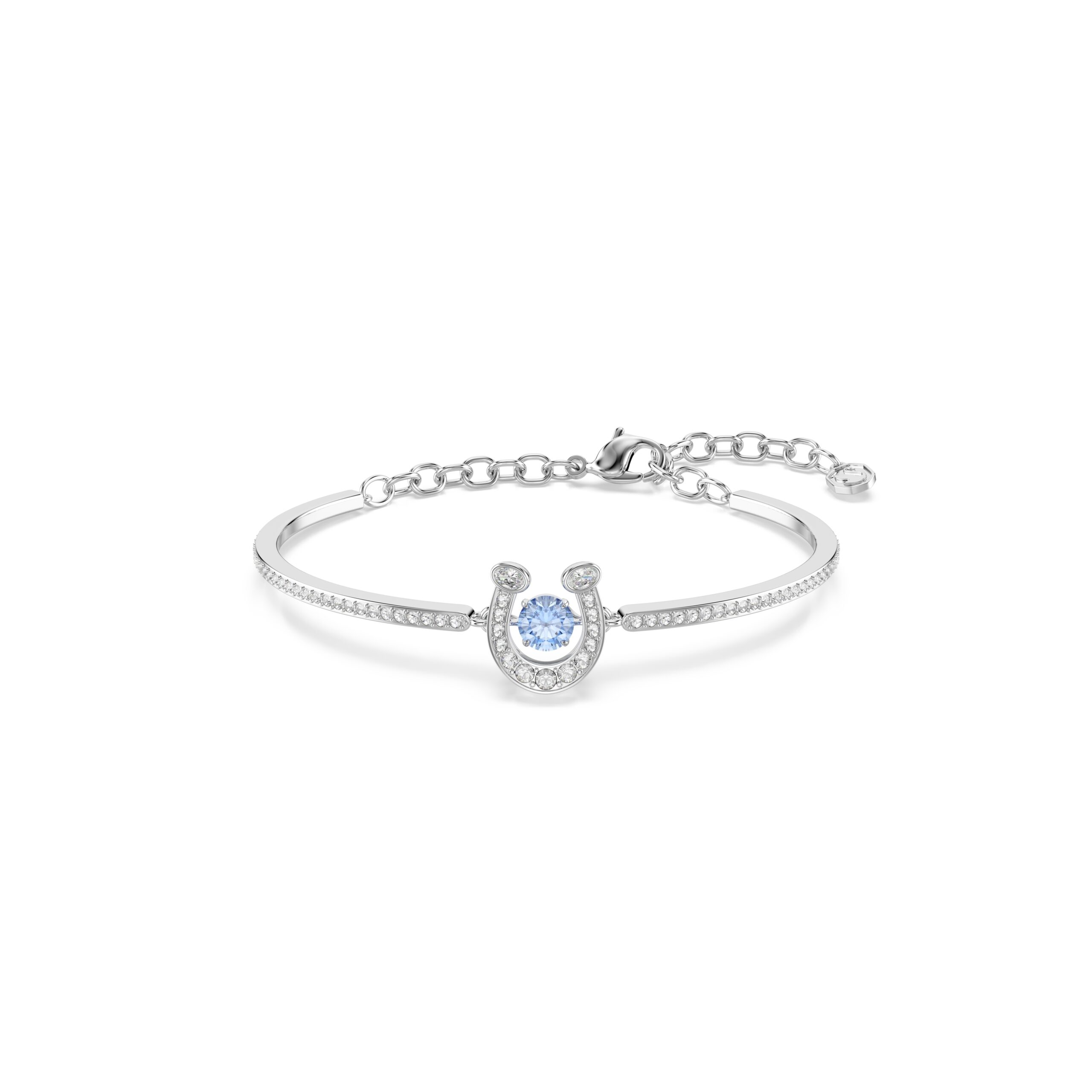Σύμβολο φιλοδοξίας και ορμής, αυτό το βραχιόλι με επιμετάλλωση ροδίου διαθέτει ένα πέταλο αλόγου με μια μπλε κινούμενη πέτρα στο κέντρο, η οποία δημιουργεί ένα συνεχές παιχνίδισμα με το φως. Η αρθρωτή βέργα περιλαμβάνει ρυθμιζόμενη αλυσίδα, για να εξασφαλίζει άνετη και εξατομικευμένη εφαρμογή. Φορέστε αυτό το άκαμπτο βραχιόλι ως το δικό σας γούρι ή χαρίστε το σε κάποιο πρόσωπο για να εμπνεύσετε άμεση επιτυχία.