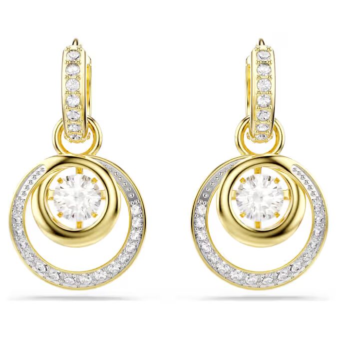 Δώστε κίνηση στο στυλ σας με αυτά τα κυκλικά σκουλαρίκια με επιμετάλλωση σε χρυσό τόνο. Συνδεδεμένο σε μίνι κρίκους pavé, κάθε κομμάτι διαθέτει μία κεντρική κινούμενη πέτρα που περιβάλλεται από σπείρες κρυστάλλων σε διάφορα μεγέθη. Φορέστε τα με ασορτί κολιέ ή δαχτυλίδι για να συνθέσετε σαγηνευτική εμφάνιση.